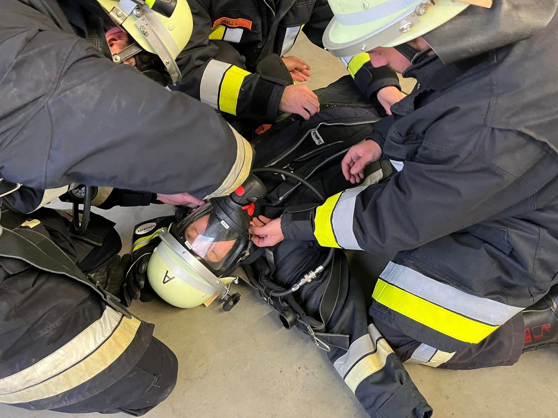 Hierbei übten wir was zu tun ist, wenn ein Kamerad im Einsatz verunfallt und wie man ihn anschließend zügig von Gerät und Maske befreit.